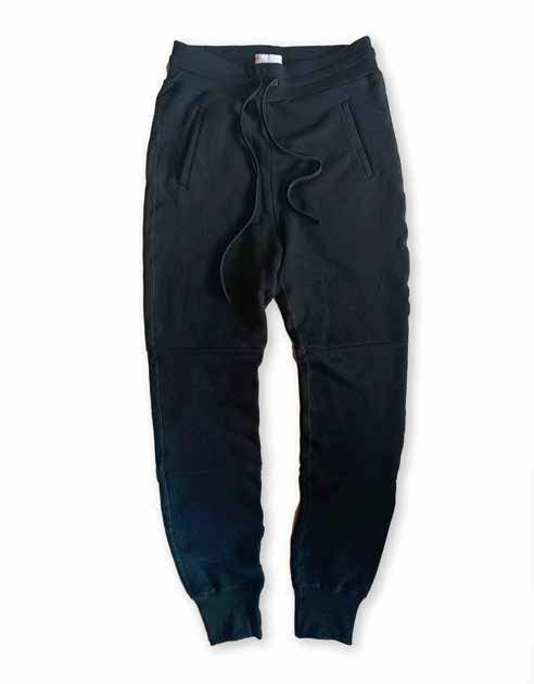 Mid weight french terry knit pant. Rib waist band & cuffs. Exterior drawcord at the waistband. Side pockets & zipper at back pocket. Made in USA